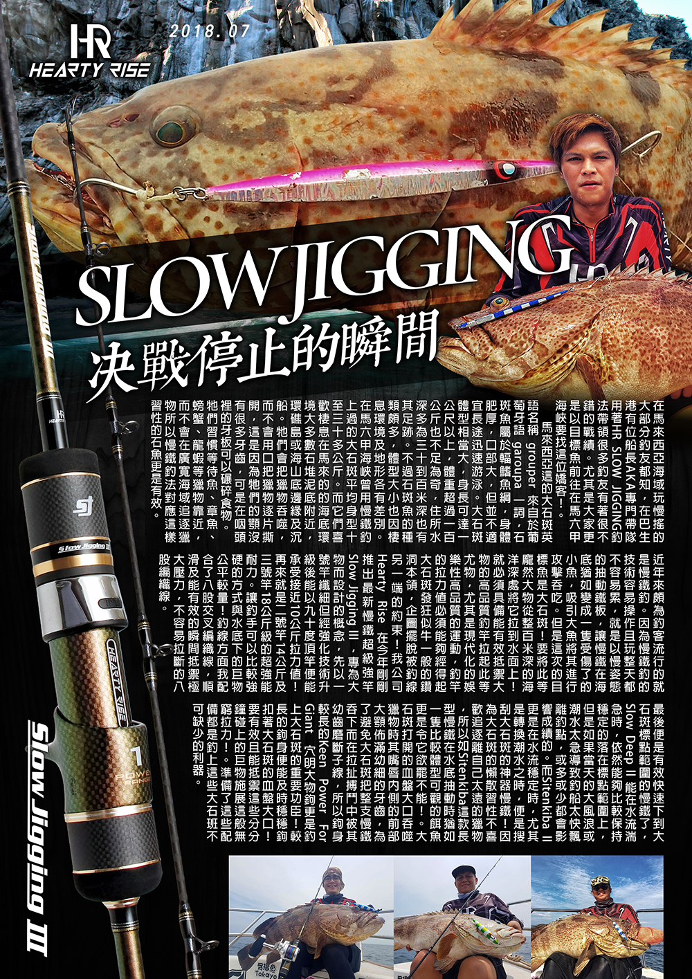 Hearty Rise 在今年剛剛推出最新慢鐵超級強竿Slow Jigging lll ,專為大物而設計的概念,先以一號竿纖細但經強化技術升級後能以九十度頂竿便能承受接近10公斤拉力值!再來就是二號竿14公斤及三號竿18公斤級的超強能耐力。讓釣手可以比較強硬的方式與水底下的巨物公平較量!釣線方面我配合了八股交叉編織線,順滑及能有效的瞬間抵禦極大壓力,不容易拉斷的八股編織線。最後便是有效快速下到大石斑標點範圍的慢鐵了,Slow Deep ll 能在水流湍急時,依然能夠比較保持穩定的落在標點範圍上,但是如果當天的大風浪或潮水太急導致釣船太快飄離釣點,或多或少都會影響成績的。而Sitenkiba ll 更是在水流穩定時,尤其是轉換潮水之時,便是搜刮大石斑的神器慢鐵!因為大石斑的懶散習性不喜歡追逐離自己太遠的獵物,所以如Sitenkiba這款長型慢鐵在水底抽動時猶如一隻比較體型可觀的餌魚更是令它欲罷不能!。大石斑打開的血盤大口吞噬獵物時其嘴唇內側的前部大顎佈滿幼細的牙齒,為了避免大石斑把整支慢鐵吞下而在拉扯搏鬥中被其幼齒磨斷子線,所以鉤身較長的Keen Power For Giant 穴明大物鉤更是釣上大石斑的重要功臣!較長的鉤身便能及時穩穩鉤扣著大石斑的血盤大口!要有效且能抵禦這些分分鐘碰上的巨物施展這般無窮拉力!。準備了這些配備都是釣上這些大石班不可缺少的利器。