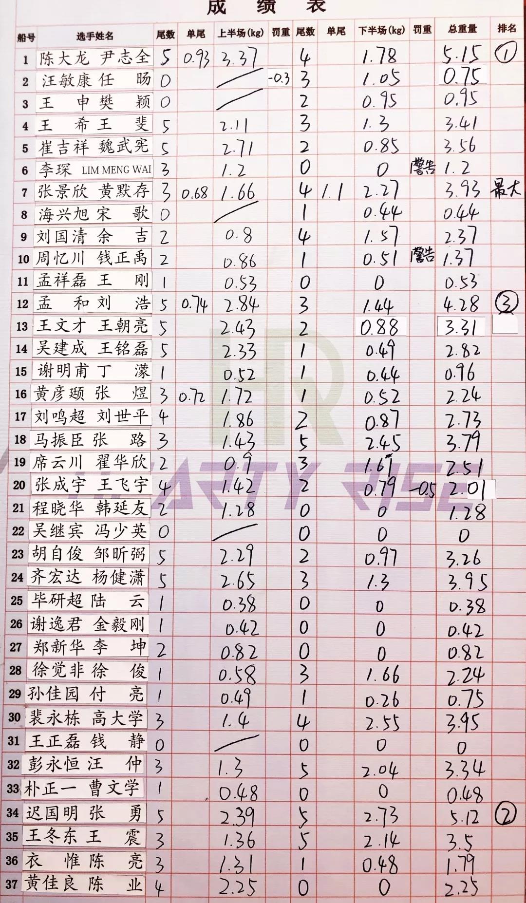 緊隨其後的是遲國明、張勇,以兩天總重5.12公斤略微落後,僅差0.03公斤,遺憾與冠軍失之交臂,獲得亞軍;