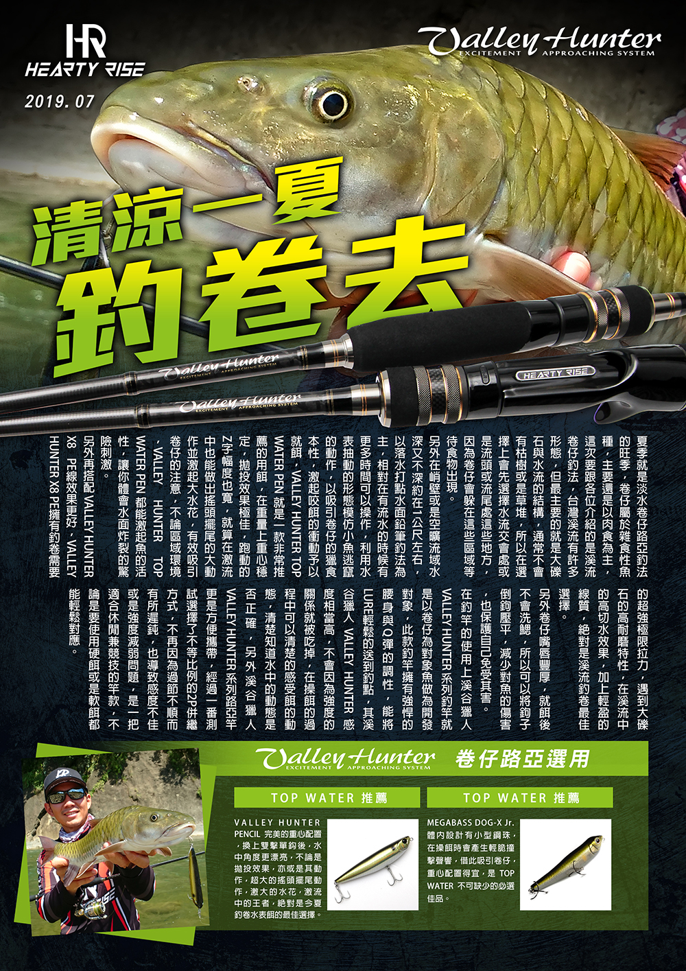 另外在峭壁或是空曠流域水深又不深約在1公尺左右,以落水打點水面鉛筆釣法為主,相對在有流水的時候有更多時間可以操作,利用水表抽動的形態模仿小魚逃竄的動作,以吸引卷仔的獵食本性,激起咬餌的衝動予以就餌,VALLEY HUNTER TOP WATER PEN就是一款非常推薦的用餌,在重量上重心穩定,拋投效果極佳,跑動的Z字幅度也寬,就算在激流中也能做出搖頭擺尾的大動作並激起大水花,有效吸引卷仔的注意,不論區域環境,VALLEY HUNTER TOP WATER PEN都能激起魚的活性,讓你體會水面炸裂的驚險刺激。