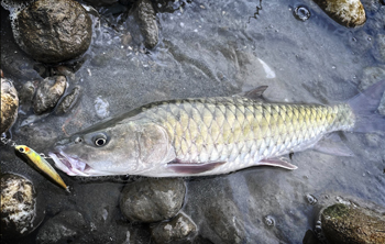 ,進行遠距離的水表狙擊,擬餌落水的瞬間及精心調教的Z字泳姿產生的飛濺水花,均能引發卷仔強烈的攻擊反射,最終一發入魂。