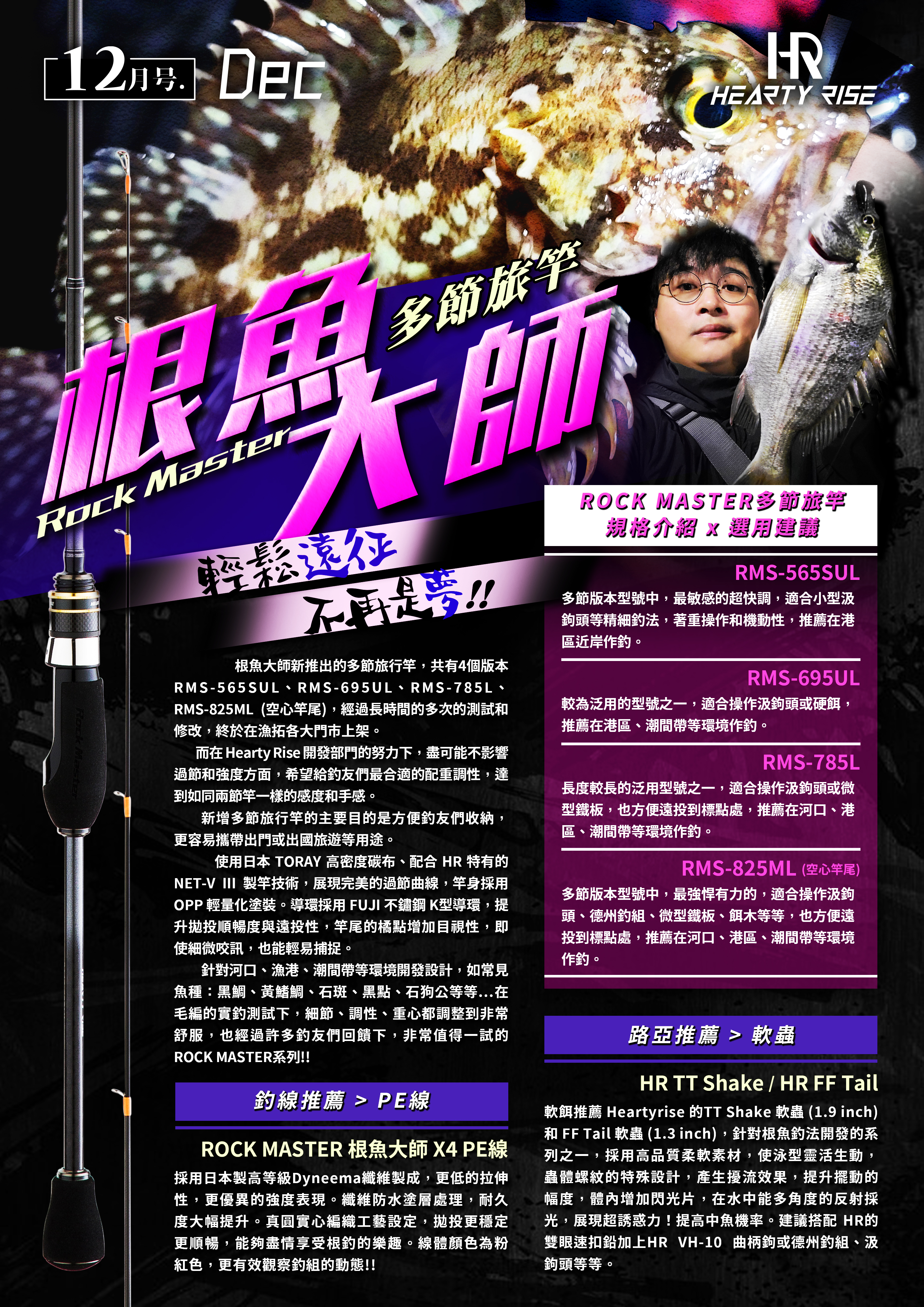 根魚大師新推出的多節旅行竿,共有 4 個版本 RMS-565SUL、RMS-695UL、RMS-785L、RMS-825ML (空心竿尾),經過長時間的多次的測試和修改,終於在漁拓各大門市上架。而在 Hearty Rise 開發部門的努力下,盡可能不影響過節和強度方面,希望給釣友們最合適的配重調性,達到如同兩節竿一樣的感度和手感。
