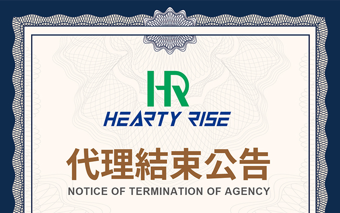 茲公告 Tokayo Sdn Bhd 關於 HEARTY RISE 品牌之代理授權書期限至西元 2023 年 12 月 31 日為止,代理期限到期後,將不再授權代理 HEARTY RISE 品牌。