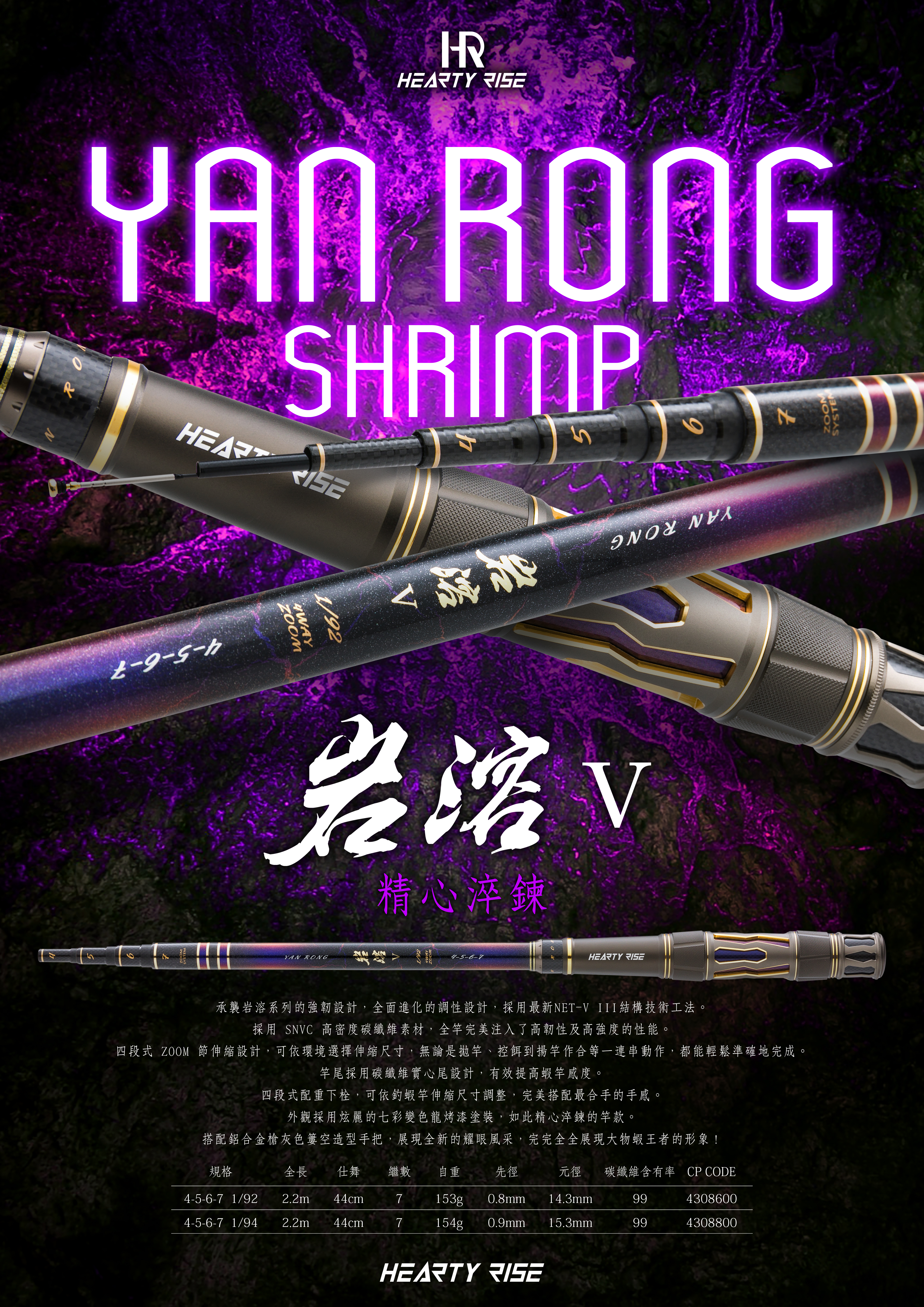 承襲岩溶系列的強韌設計,全面進化的調性設計,採用最新 NET-V III 結構技術工法 ,並採用 SNVC 高密度碳纖維素材,全竿完美注入了高韌性及高強度的性能。超高硬度的調性,能完全將打蝦時的力道導入到鉤尖,並由借力使力的原理,能更加快速度的將大物蝦拉出水面,並使其竿身也不會產生任何的多於晃動。竿先採用岩溶直感萬轉橞先,大大提升滑順度與敏感度。四段式 ZOOM 節伸縮設計,可依環境選擇伸縮尺寸,無論是拋竿、控餌到揚竿作合等一連串動作,都能輕鬆準確地的完成。竿尾採用碳纖維實心尾設計,有效提竿蝦竿感度,並且在搏蝦時四段式配重下栓,可依釣蝦竿伸縮尺寸調整,完美搭配最合手的手感。外觀採用炫麗的七彩變色龍烤漆塗裝,如此精心淬鍊的竿款,搭配鋁合金槍灰色簍空造型手把,展現全新的耀眼風采,完完全全展現大物蝦王者的形象!