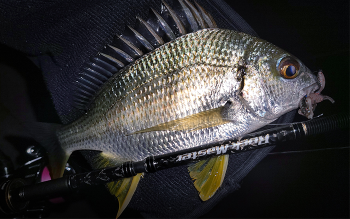 秋末準備過冬天的黑鯛為囤積體內脂肪而靠岸大量覓食,是釣獲牠們的好時機,這次使用 ROCK MASTER 根魚大師多節旅行竿作釣,纖細的實心竿先,使用輕量的JIG 時,擁有良好的操作感,搭配蝦型軟餌使用,蝦型的優勢是擾流波動較多,在一波細膩的操作下,鯛民怎麼可能忍住不來一口呢!?