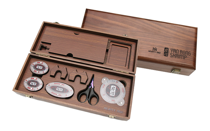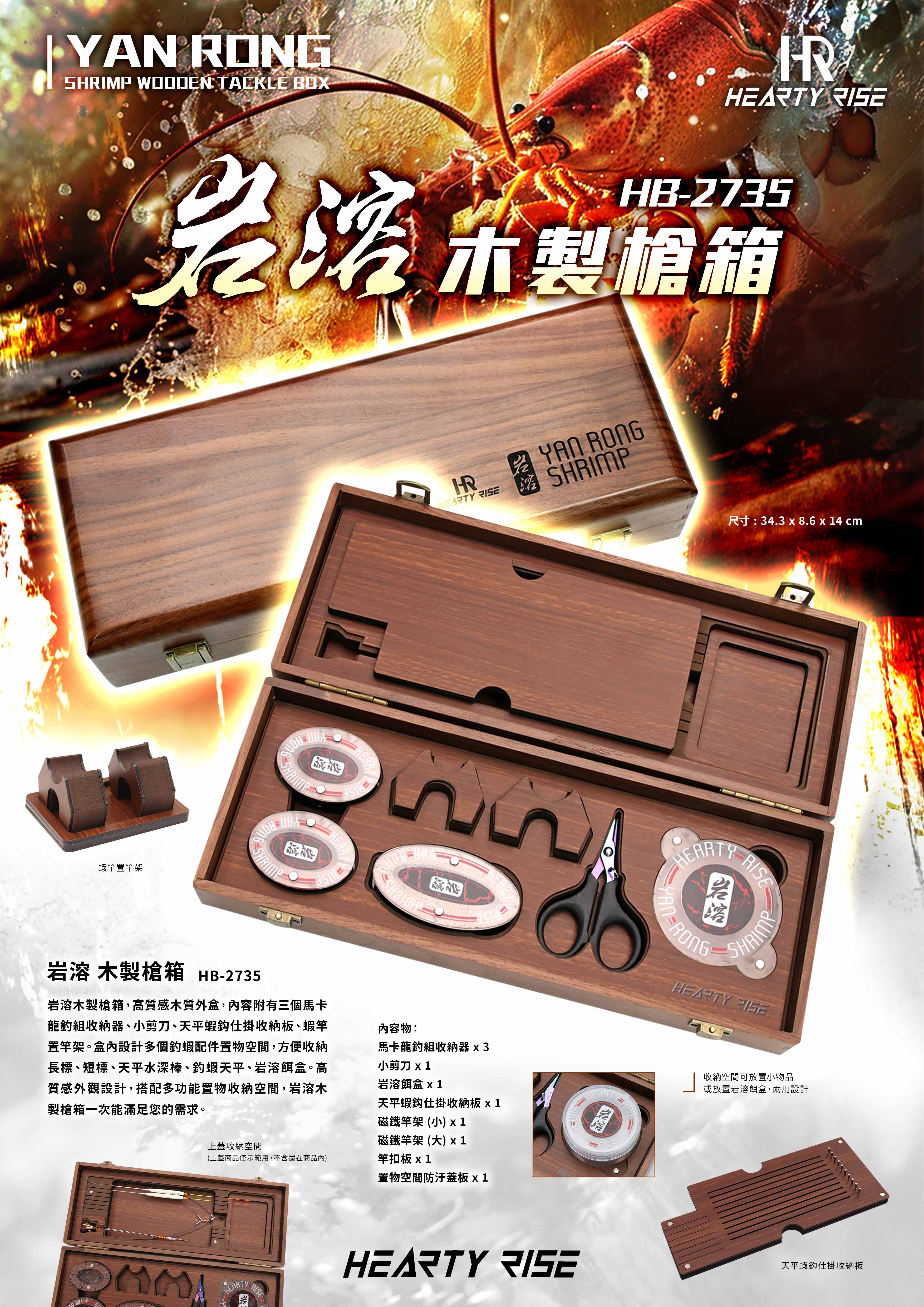 岩溶木製槍箱,高質感木質外盒,內容附有三個馬卡龍釣組收納器、小剪刀、天平蝦鈎仕掛收納板、蝦竿置竿架。