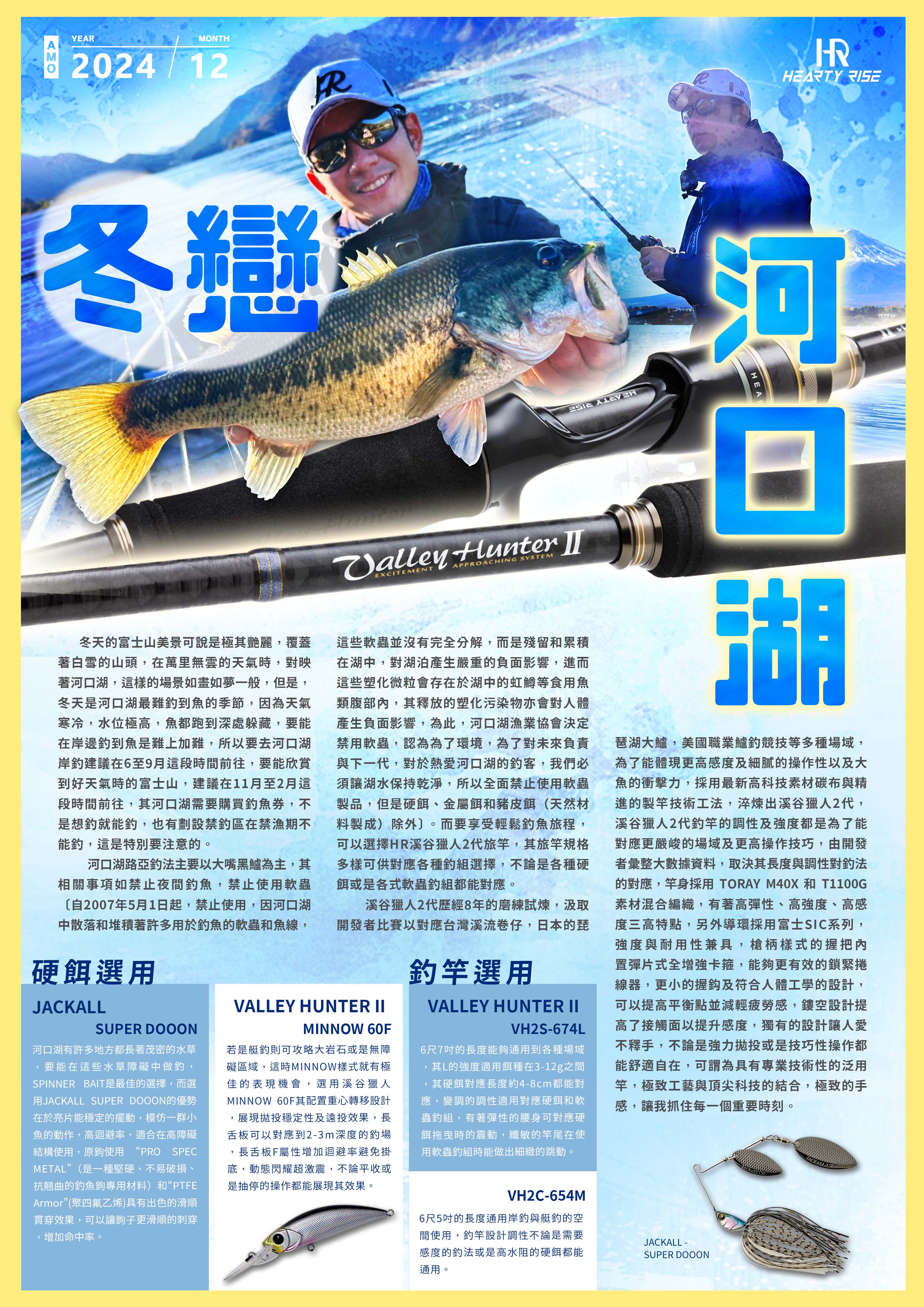 河口湖路亞釣法主要以大嘴黑鱸為主,其相關事項如禁止夜間釣魚, 禁止使用軟蟲 〔自2007年5月1日起,禁止使用,因河口湖中散落和堆積著許多用於釣魚的軟蟲和魚線,這些軟蟲並沒有完全分解,而是殘留和累積在湖中,對湖泊產生嚴重的負面影響,進而這些塑化微粒會存在於湖中的虹鱒等食用魚類腹部內,其釋放的塑化污染物亦會對人體產生負面影響,為此,河口湖漁業協會決定禁用軟蟲,認為為了環境,為了對未來負責與下一代,對於熱愛河口湖的釣客,我們必須讓湖水保持乾淨,所以全面禁止使用軟蟲製品,但是硬餌、金屬餌和豬皮餌(天然材料製成)除外〕。而要享受輕鬆釣魚旅程,可以選擇 HR 溪谷獵人2代旅竿,其旅竿規格多樣可供對應各種釣組選擇,不論是各種硬餌或是各式軟蟲釣組都能對應。
