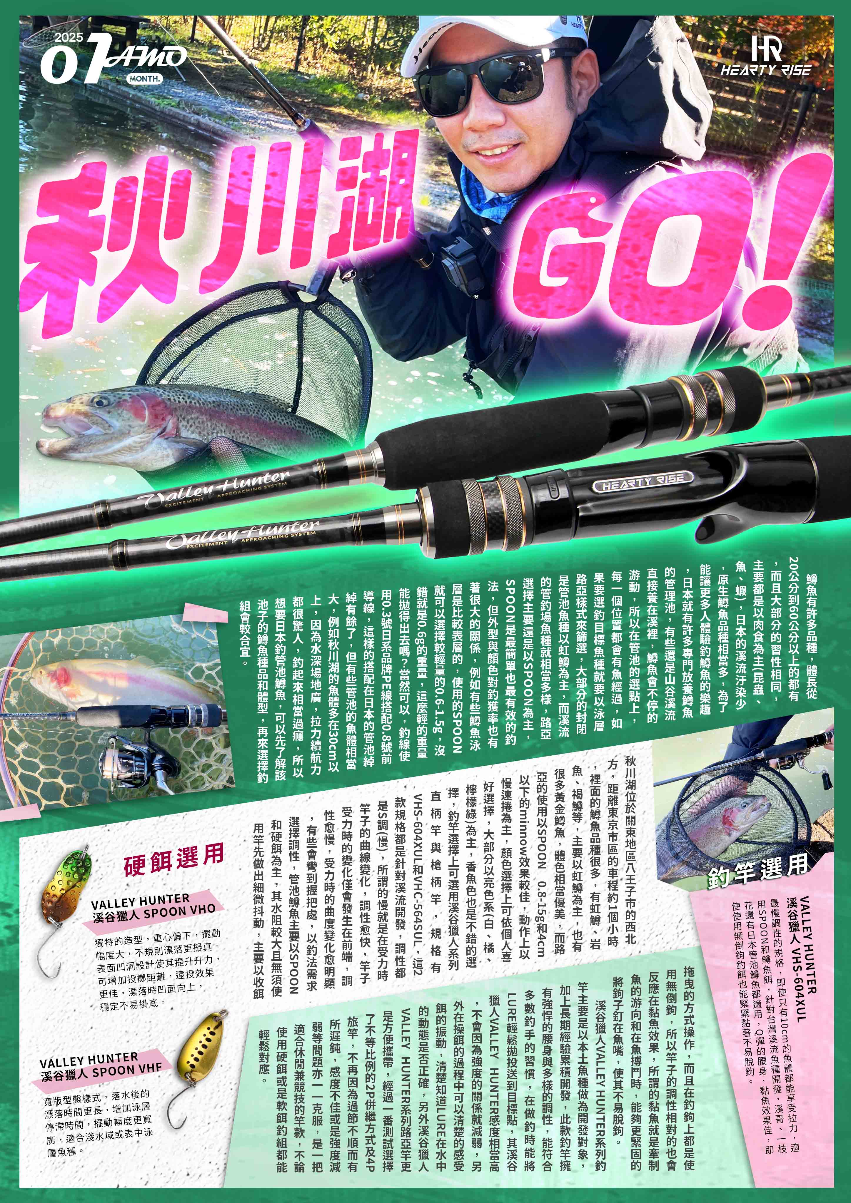 秋川湖位於關東地區八王子市的西北方,距離東京市區的車程約 1 個小時,裡面的鱒魚品種很多,有虹鱒、岩魚、褐鱒等,主要以虹鱒為主,也有很多黃金鱒魚,體色相當優美,而路亞的使用以 SPOON 0.8 - 15 g 和 4 cm 以下的 MINNOW 效果較佳,動作上以慢速捲為主,顏色選擇上可依個人喜好選擇,大部分以亮色系 ( 白、橘、檸檬綠 ) 為主,香魚色也是不錯的選擇,釣竿選擇上可選用溪谷獵人系列直柄竿與槍柄竿,規格有 VHS-604XUL 和 VHC - 564SUL,這2款規格都是針對溪流開發,調性都是 S 調 ( 慢 ),所謂的慢就是在受力時竿子的曲線變化,調性愈快,竿子受力時的變化僅會發生在前端,調性愈慢,受力時的曲度變化愈明顯,有些會彎到握把處,以釣法需求選擇調性,管池鱒魚主要以 SPOON 和硬餌為主,其水阻較大且無須使用竿先做出細微抖動,主要以收餌拖曳的方式操作,而且在釣鉤上都是使用無倒鉤,所以竿子的調性相對的也會反應在黏魚效果,所謂的黏魚就是牽制魚的游向和在魚搏鬥時,能夠更緊固的將鉤子釘在魚嘴,使其不易脫鉤。