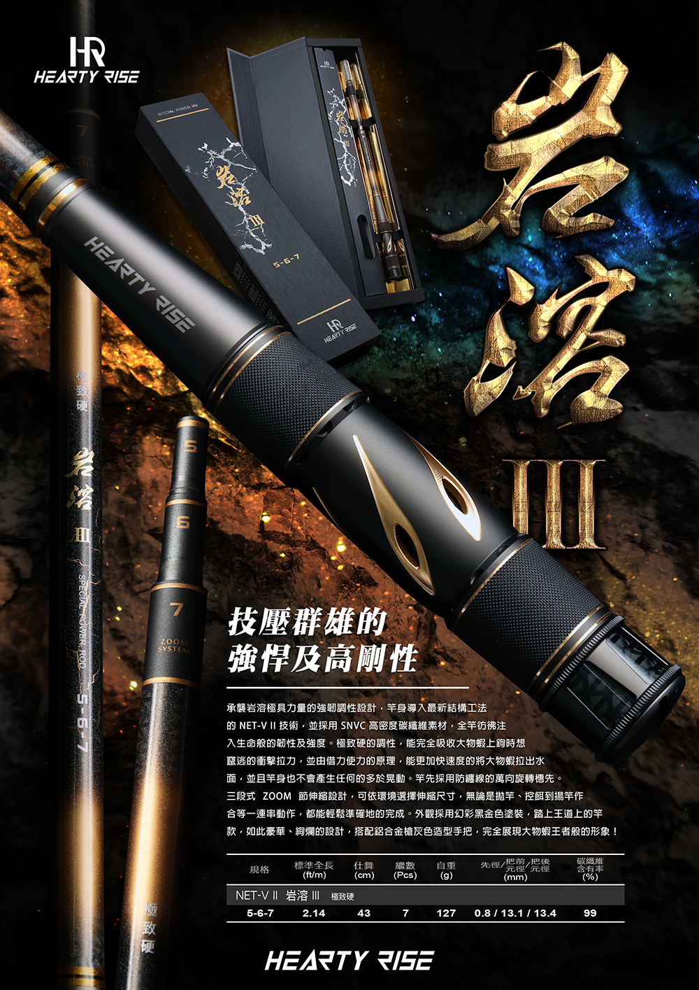 承襲岩溶極具力量的強韌調性設計,竿身導入最新結構工法的 NET-V II 技術,並採用 SNVC 高密度碳纖維素材,全竿彷彿注入生命般的韌性及強度。極致硬的調性,能完全吸收大物蝦上鉤時想竄逃的衝擊拉力,並由借力使力的原理,能更加快速度的將大物蝦拉出水面,並且竿身也不會產生任何的多於晃動。竿先採用防纏線的萬向旋轉橞先。三段式 ZOOM 節伸縮設計,可依環境選擇伸縮尺寸,無論是拋竿、控餌到揚竿作合等一連串動作,都能輕鬆準確地的完成。外觀採用幻彩黑金色塗裝,踏上王道上的竿款,如此豪華、絢爛的設計,搭配鋁合金槍灰色造型手把,完全展現大物蝦王者般的形象!