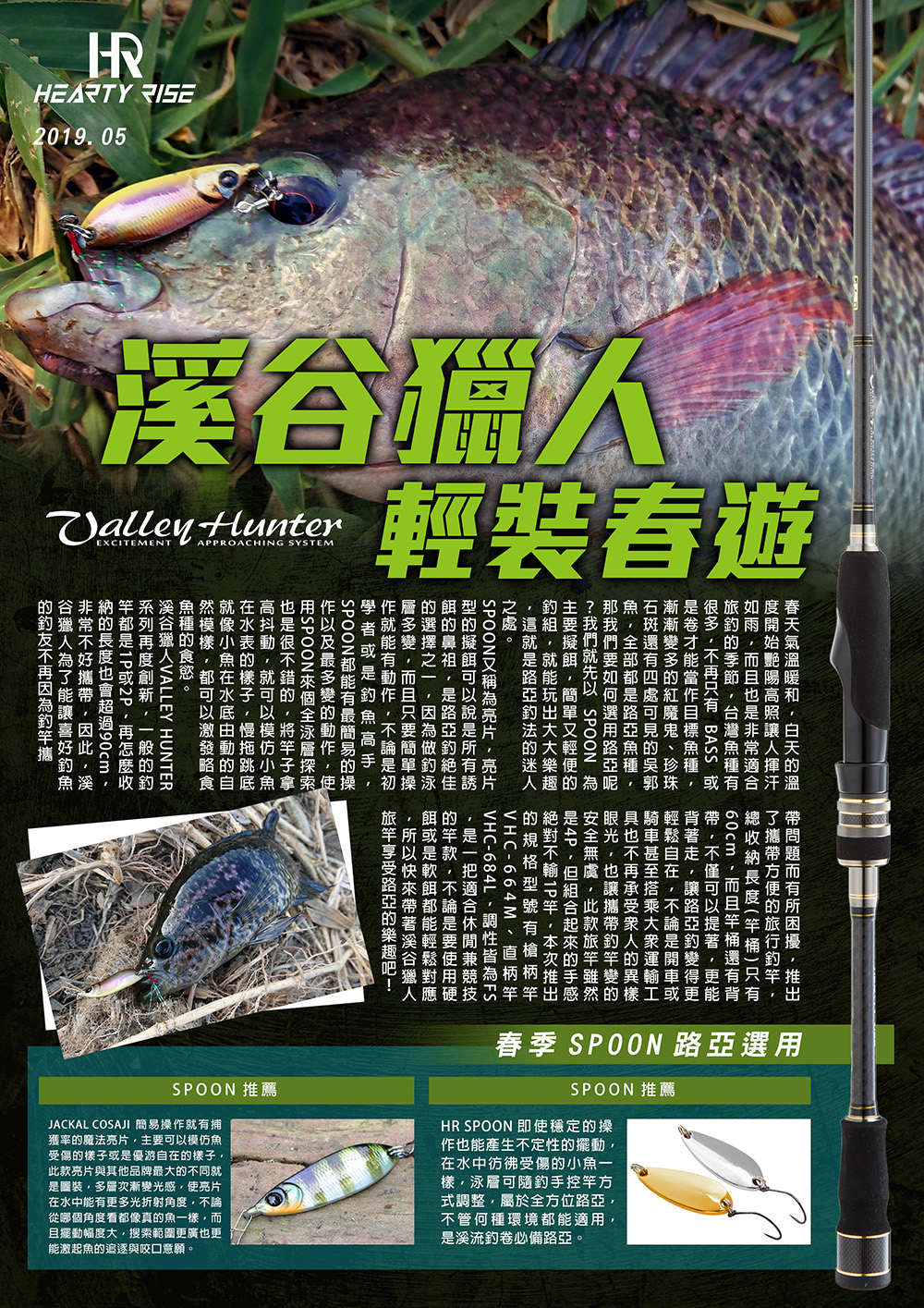 Valley hunter has been level up once again, usually fishing rod is in one or two pieces, and the storage size is usually over 90cm, which is not easy to carry around, thus we develop the new Valley Hunter that the storage size is only 60cm, which you can carry around easily on any kind of transportation, although it’s in four pieces, the action is as good as a one piece rod. The models we have now is VHC-664M(casting) and VHC-684L(spinning),action is FS, and can easily manipulate lures whether it’s hard or soft, so please enjoy your spring fishing with Valley Hunter.