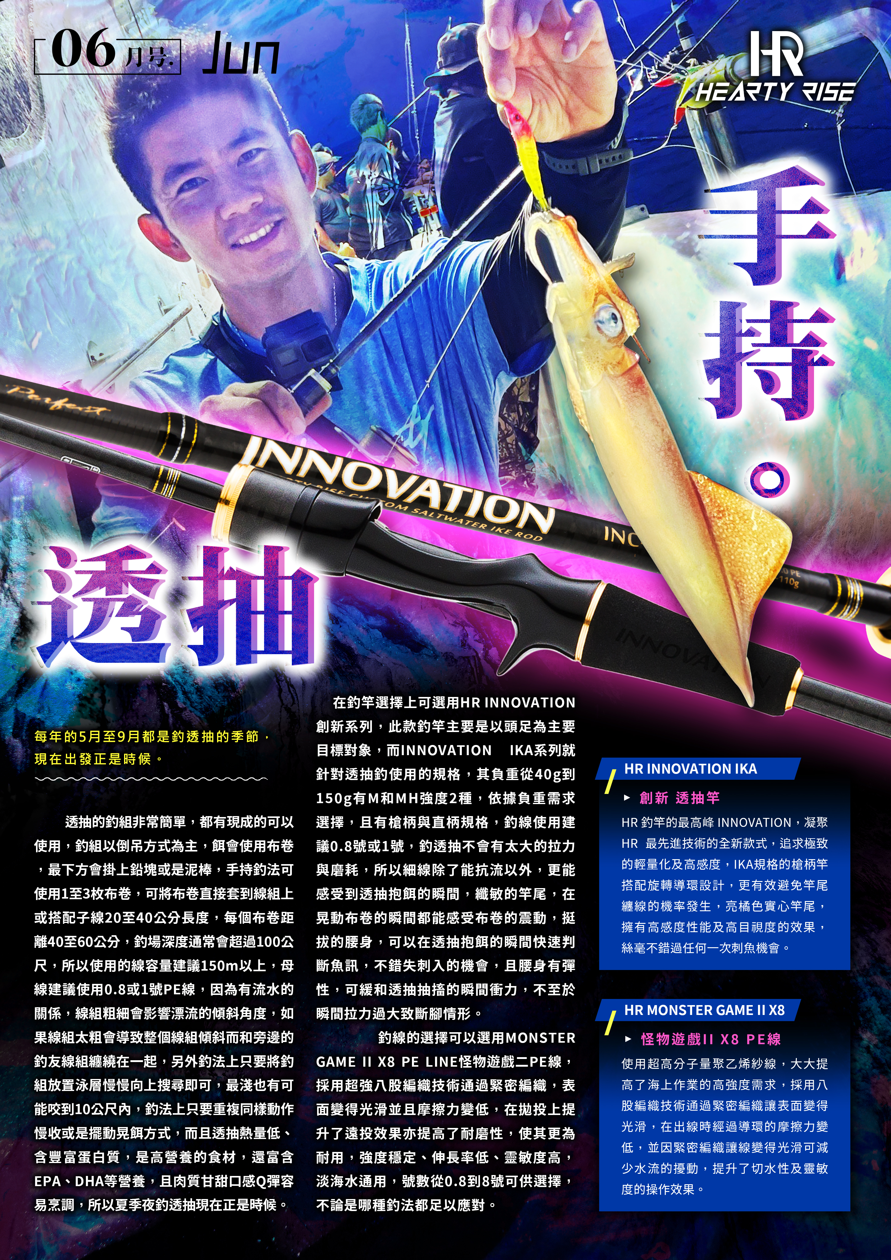 For rod selection, you can choose HR INNOVATION series, which is designed primarily for targeting cephalopods. INNOVATION IKA series is specifically tailored for squid fishing, with weights ranging from 40g to 150g and available power in M and MH, allowing you to select based on your weight requirements. This series comes in both casting and spinning models. It is recommended to use line sizes 0.8 or 1, as squid fishing doesn't involve excessive pulling or abrasion. Thinner lines not only resist current but also enhance your ability to feel the moment a squid takes the bait. The sensitive tip allows you to detect vibrations from the cloth rolls instantly. Its sturdy back helps you quickly discern fish signals when a squid bites, ensuring you don’t miss the chance to set the hook. The rod's flexible body can absorb the sudden force from a squid's struggle, preventing breakage due to excessive tension.