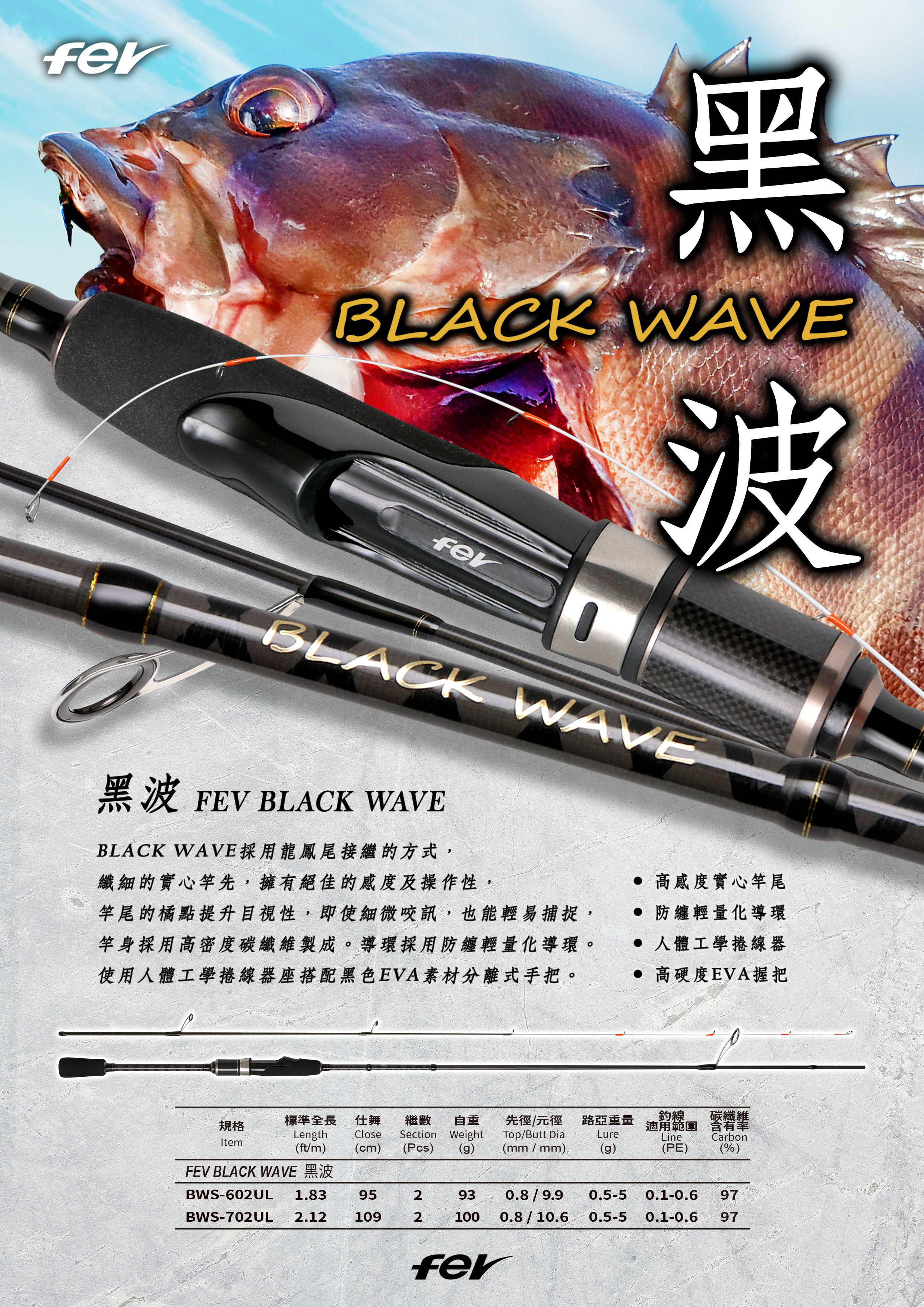 BLACK WAVE using solid tip connected with a tubular design, slim solid tip provides great sensitivity and operability. The orange dots on the rod tip makes it easier to spot, even the smallest signal can be captured easily. The rod blank is made of high-density carbon fiber, with light anti-tangle guides, and an ergonomic reel seat with EVA detachable grip.