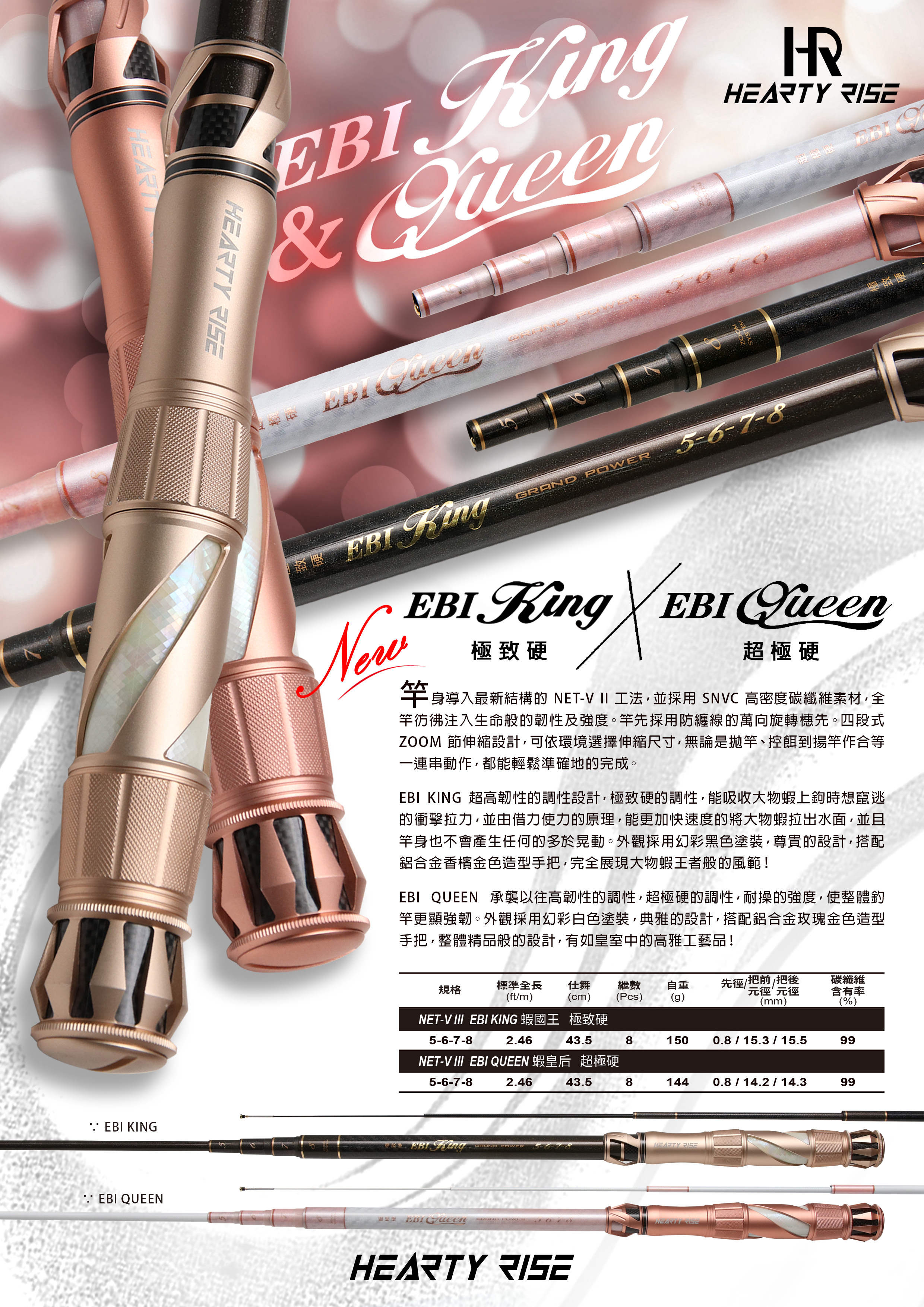 EBI KING its superlative tenacity and stiff action will assimilate the struggling force of the shrimp and pull the shrimp out of the water quickly without being over-vibrated. The black painting and the champagne gold color aluminum components represent its kingship!