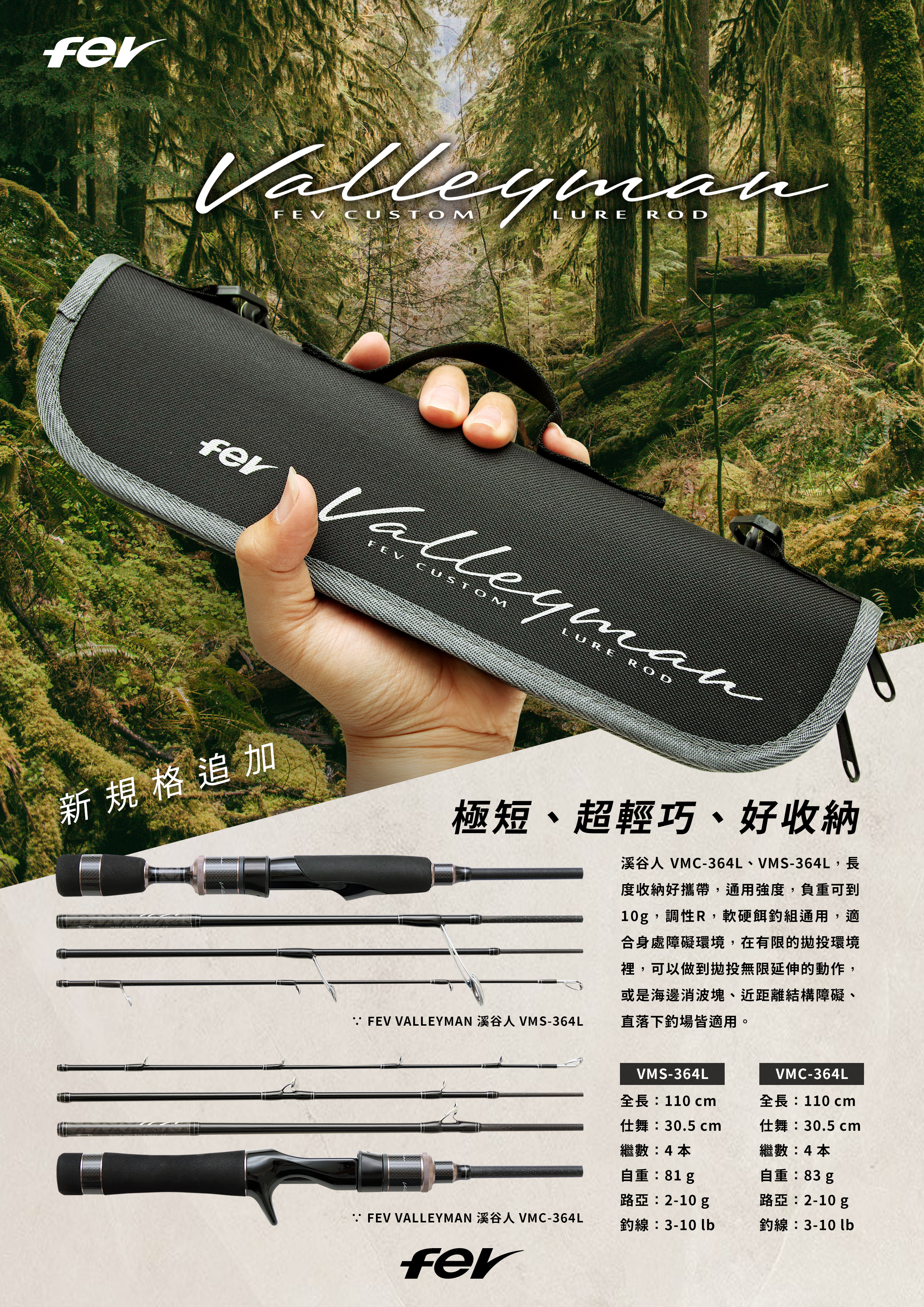 | 規格 Item | 全長 Length (m) | 仕舞 Close (cm) | 繼數 Section (Pcs) | 自重 Weight (g) | 先徑 Top (mm) | 元徑 Butt Dia (mm) | 路亞重量 Lure (g) | 釣線 Line (lb) | 碳纖維含有率 CARBON (%) |