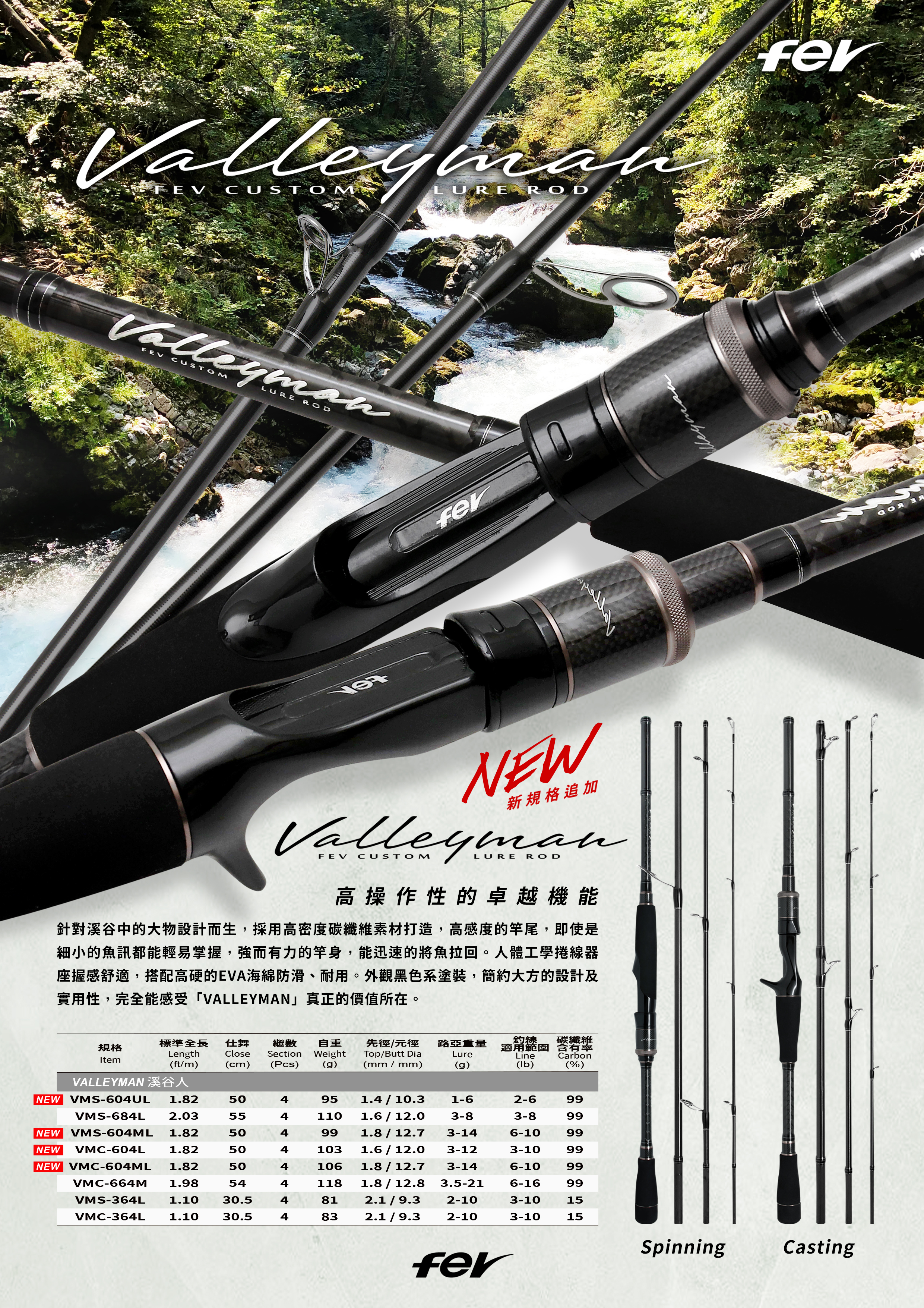 It is designed for the big creatures in the valley. Built with high-density carbon fiber fabric, the sensitive rod tip makes it easier to control the small signals. The strong blank makes it easy to pull back the fish. The reel seat is designed with the ergonomic concept which is very comfortable to hold. Along with some EVA sponges, it is skid-proof, stiff, and durable. The black cosmetic makes the rod more simple. With great practicability, we can feel the true value of VALLEYMAN