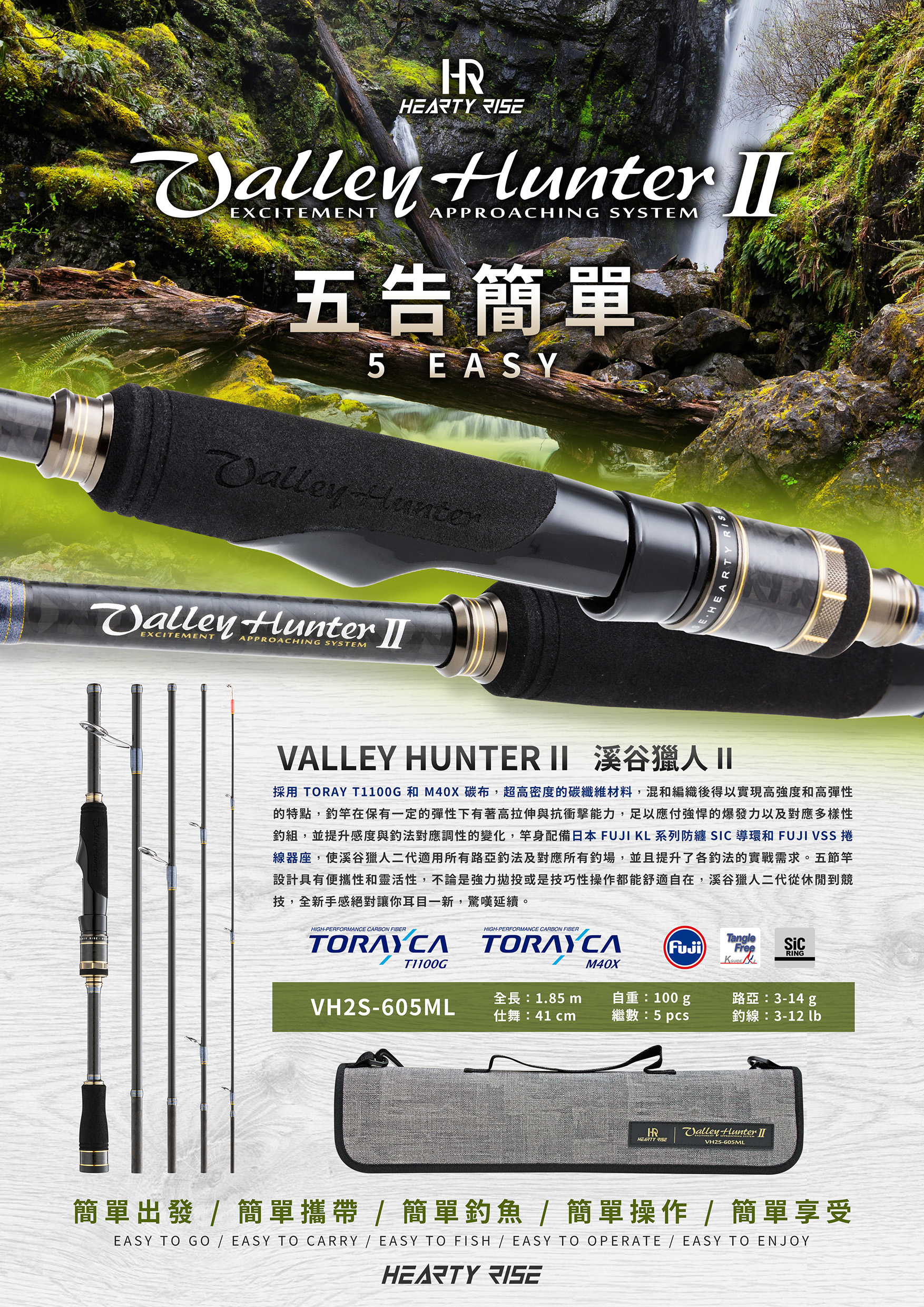 Retaining the robust performance and versatility of the first generation, Valley Hunter II utilizes TORAY T1100G and M40X carbon fabrics, ultra-high-density carbon fiber materials. Through a blend of weaving, it achieves high strength and elasticity, allowing the fishing rod to maintain a certain degree of flexibility while possessing high tensile and impact resistance capabilities. This enables it to cope with powerful bursts and accommodate diverse fishing setups, enhancing sensitivity and adaptability to various fishing techniques. The guide rings adopt Fuji SIC series, combining strength and durability. Valley Hunter II is suitable for all lure fishing techniques and can adapt to all fishing grounds, elevating the practical requirements of each fishing technique. It embodies three key features: high sensitivity, high strength, and high elasticity. Whether it's Holland's crap, pearl grouper, bass, barred flagtail, or vigorous fish like snakehead or peacock cichlid, they all have corresponding specifications. It's also suitable for saltwater. Additionally, Valley Hunter II's casting handle grip features an internally embedded spring-loaded full-reinforcement clamp, effectively locking the line roller. With a smaller hook grip and ergonomic design, it enhances balance and reduces fatigue. The hollow design increases contact surface to improve sensitivity. Its unique design is irresistible, providing comfort and ease for both powerful casting and intricate maneuvers. From leisure to competitive fishing, the brand-new tactile sensation of Valley Hunter II will surely leave you amazed, continuing to impress.
