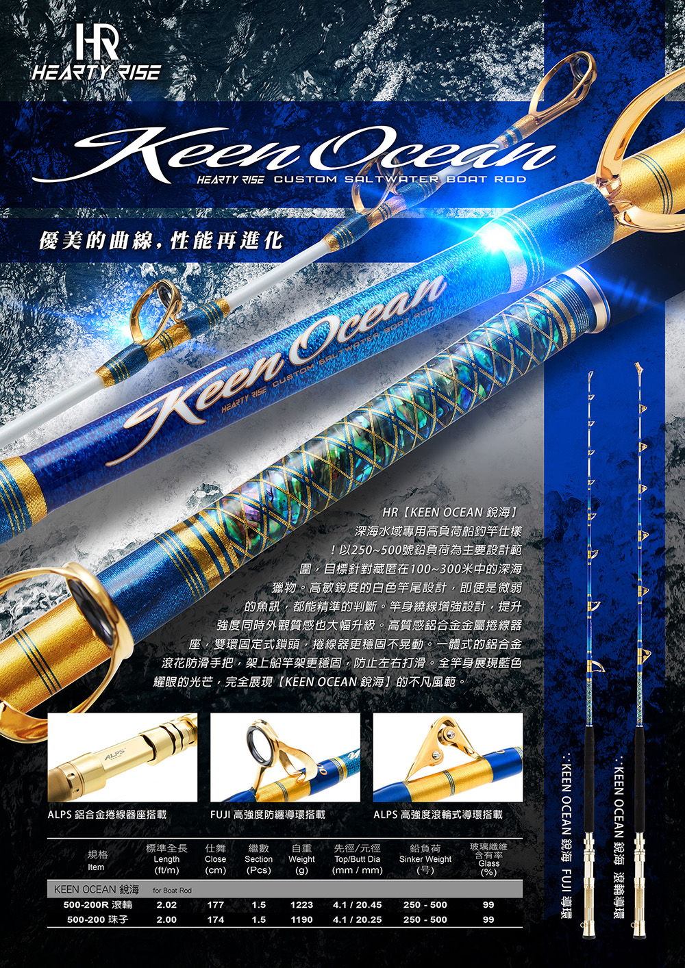 HR【KEEN OCEAN 銳海】深海水域專用高負荷船釣竿仕樣! 以250~500號鉛負荷為主要設計範圍,目標針對藏匿在100~300米中的深海獵物。高敏銳度的白色竿尾設計,即使是微弱的魚訊,都能精準的判斷。竿身繞線增強設計,提升強度同時外觀質感也大幅升級。高質感鋁合金金屬捲線器座,雙環固定式鎖頭,捲線器更穩固不晃動。一體式的鋁合金滾花防滑手把,架上船竿架更穩固,防止左右打滑。全竿身展現藍色耀眼的光芒,完全展現【KEEN OCEAN 銳海】的不凡風範。 HR KEEN OCEAN 銳海