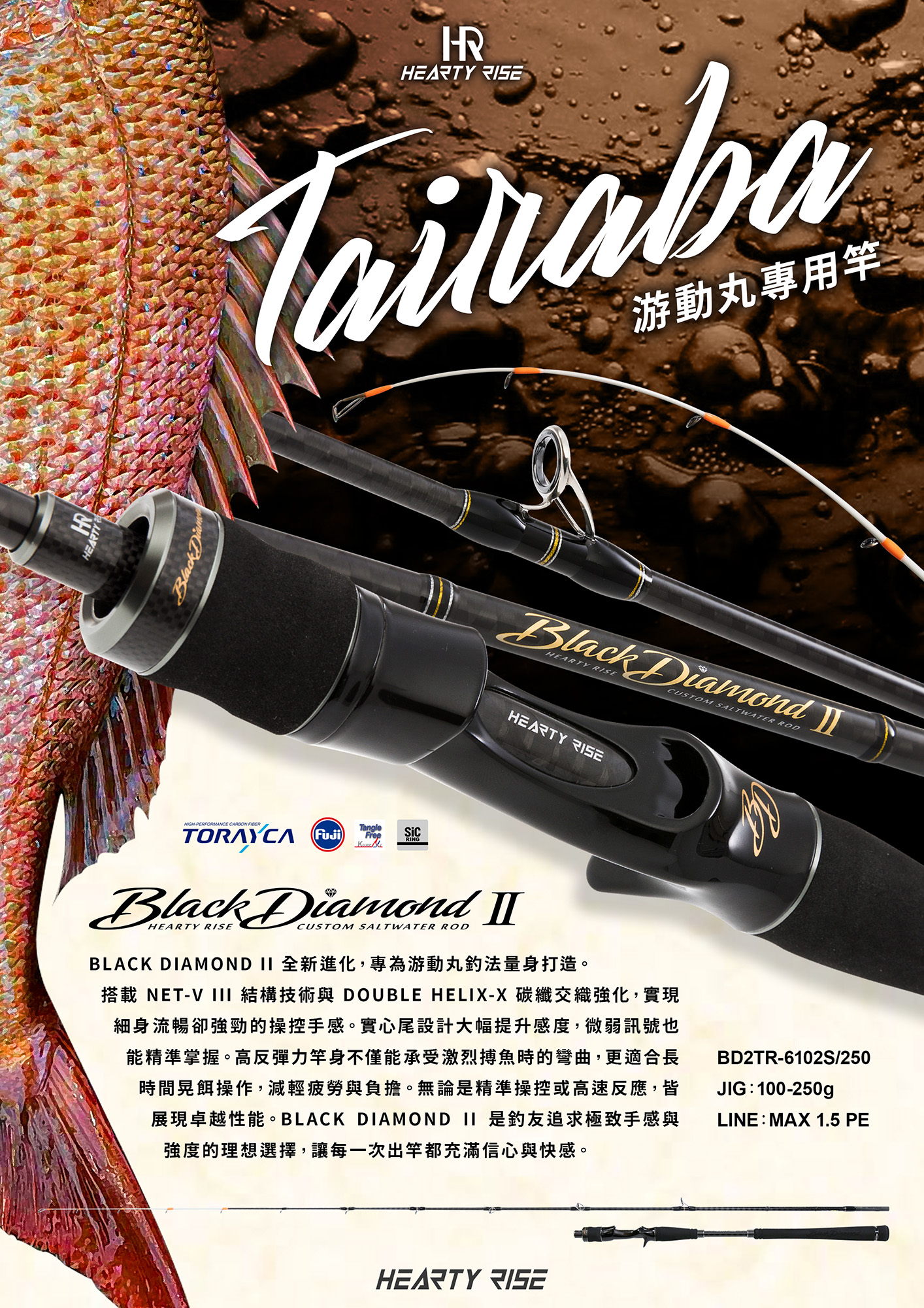 BLACK DIAMOND II 全新進化的高強度性能實現。採用 NET-V III 竿身結構技術及 DOUBLE HELIX - X 碳帶交叉編織強化技術,實現「細身」、「流暢」及「強勁」的操作手感。以強韌竿身進行快節奏的晃餌操作,可以減輕釣友負擔及疲累感。藉由高反彈力的竿身,可以承受強力博魚時竿身的大幅度彎曲。全新進化的鐵板竿系列,獻給追求極致鐵板釣的釣友們。