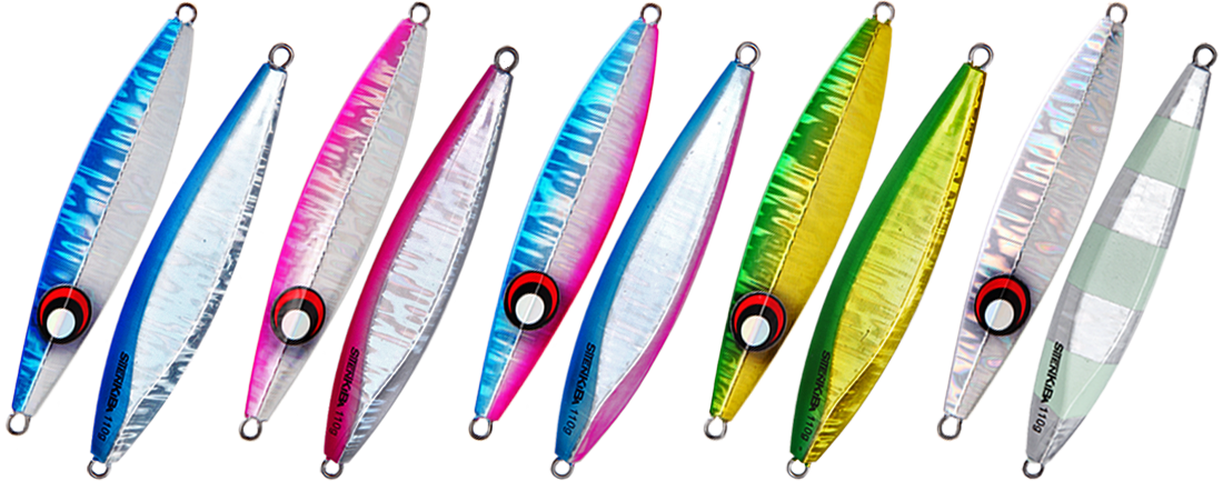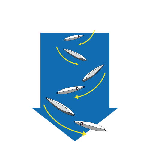 紫電之牙鐵板的重心部份使用特別配重設計,配合鐵板流線在水中落下時,能抑制鐵板原本的過度橫向移動,讓鐵板在晃動時不會偏離軸心的情況下,實現左右搖擺,中部搖擺的微波動等的姿態,讓魚群們產生想咬餌的衝動!