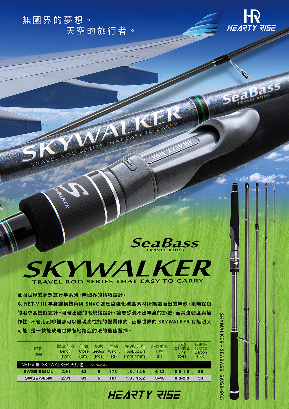 征服世界的夢想旅行竿系列,無國界的精巧設計。以 NET-V III 竿身結構技術與 SNVC 高密度強化碳纖素材所編織而出的竿款,毫無保留的追求高機能設計。可帶出國的高規格設計,讓您感覺不出竿身的節數,而其強韌度與操作性,不管走到哪裡都可以展現高性能的優質作釣。征服世界的 SKYWALKER 有無限大可能,是一款能攻略世界各地路亞釣法的最佳選擇。