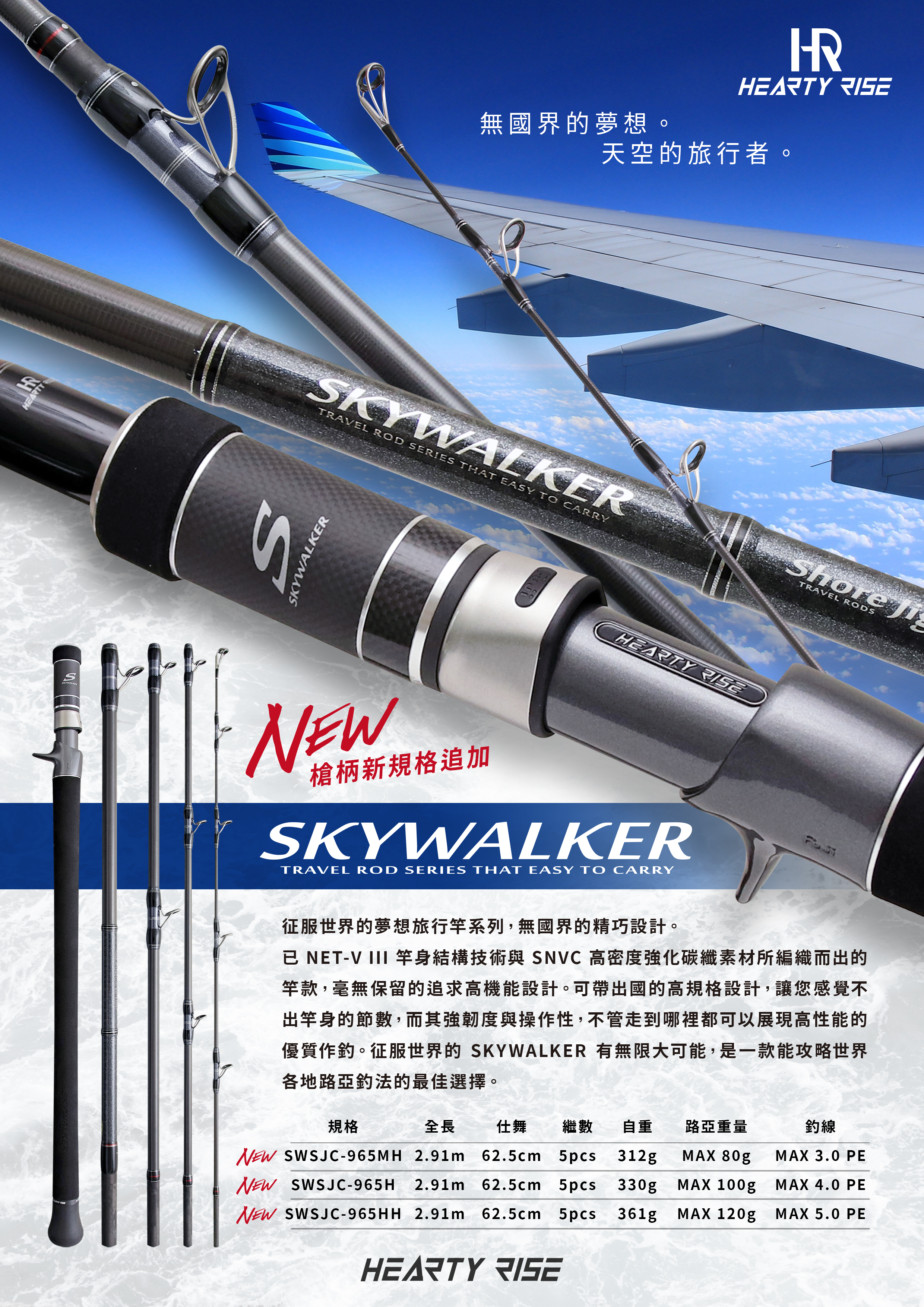 征服世界的夢想旅行竿系列,無國界的精巧設計。以 NET-V III 竿身結構技術與 SNVC 高密度強化碳纖素材所編織而出的竿款,毫無保留的追求高機能設計。可帶出國的高規格設計,讓您感覺不出竿身的節數,而其強韌度與操作性,不管走到哪裡都可以展現高性能的優質作釣。征服世界的 SKYWALKER 有無限大可能,是一款能攻略世界各地路亞釣法的最佳選擇。