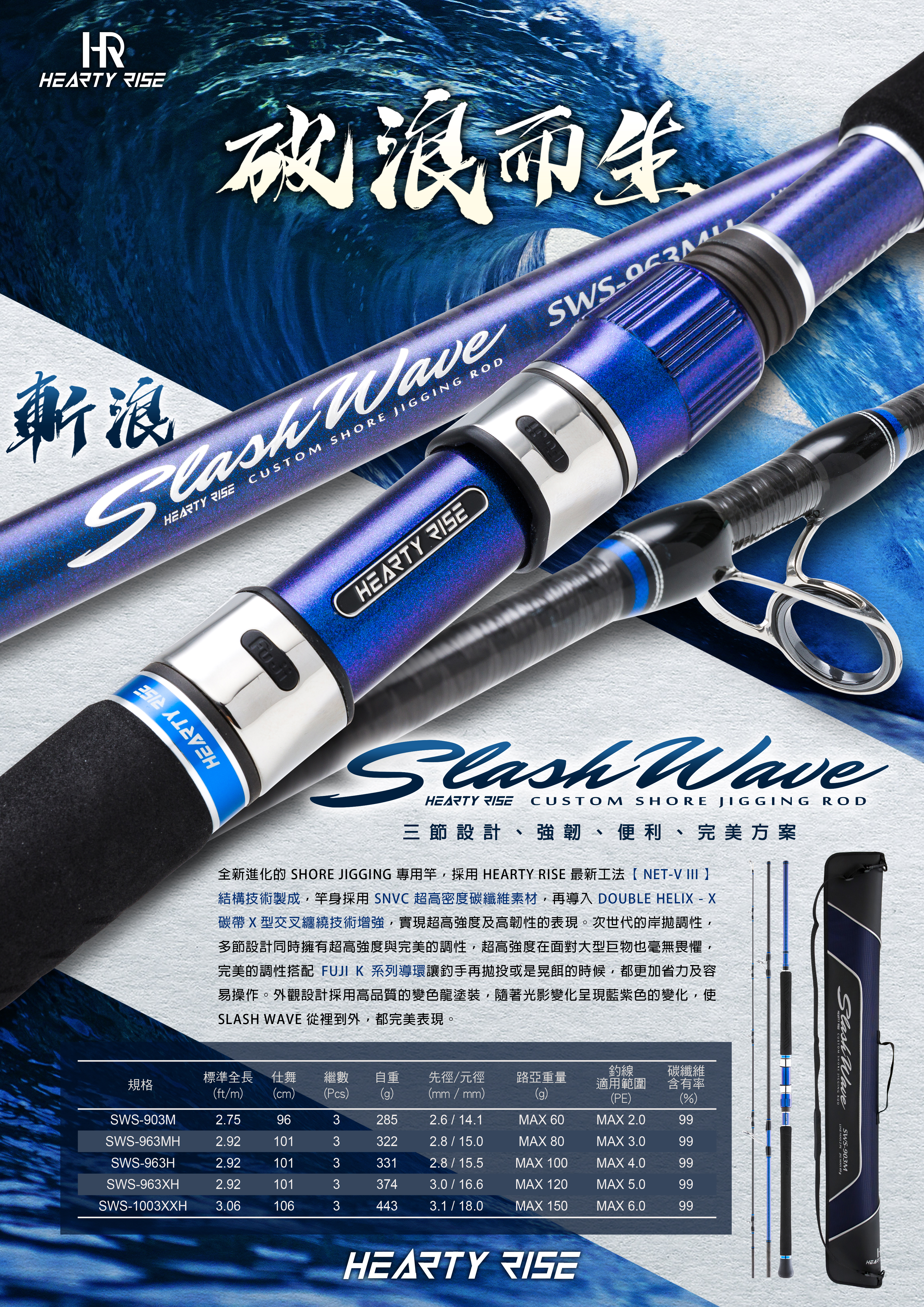 次世代的岸拋竿調性,同時擁有超高強度與完美的調性,超高強度在面對大型巨物也毫無畏懼,完美的調性搭配 FUJI K系列導環讓釣手再拋投或是晃餌的時候,都更加省力及容易操作。外觀設計採用高品質的變色龍塗裝,隨著光影變化呈現藍紫色的變化,使 SLASH WAVE 從裡到外,都完美表現。